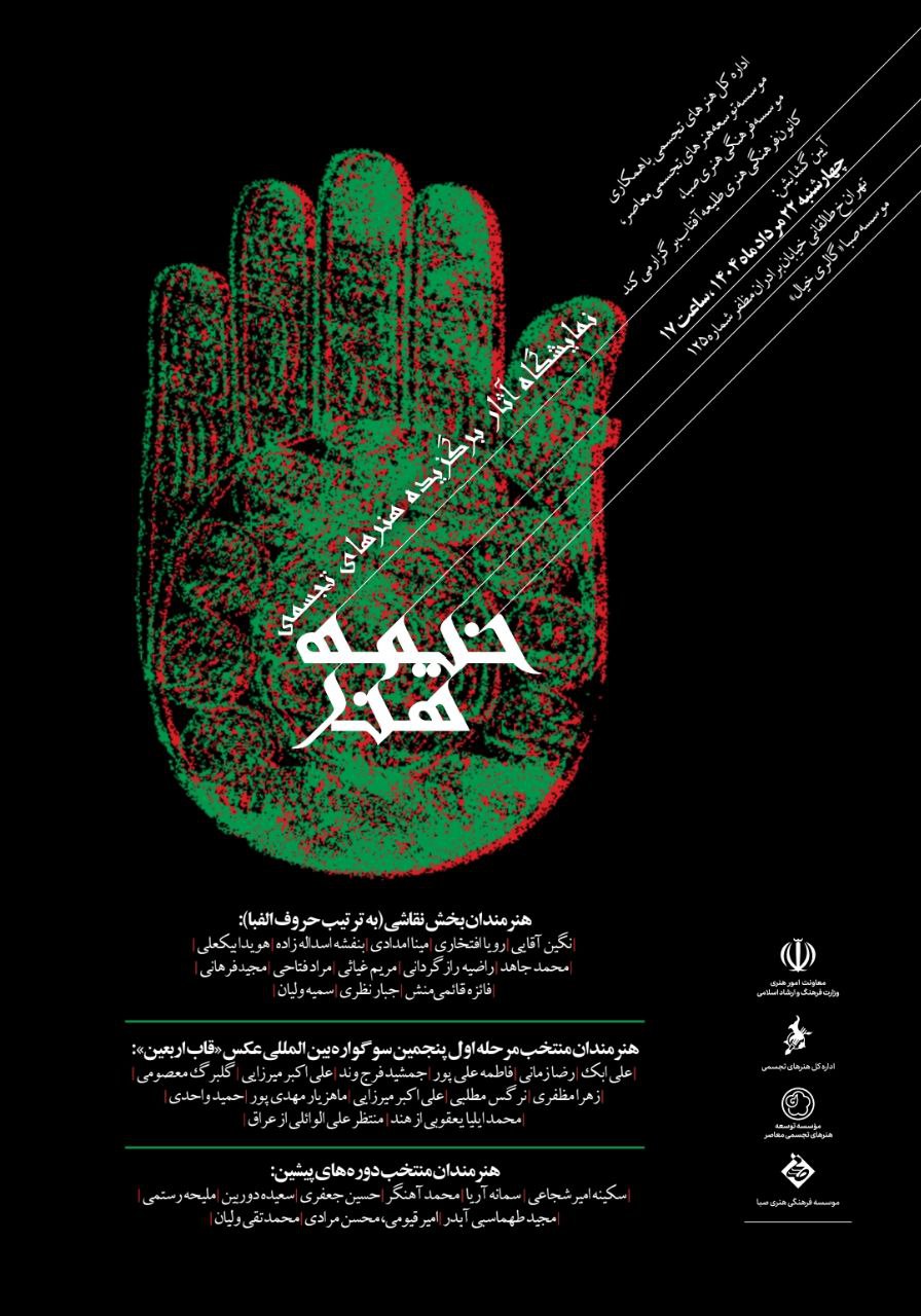 به گزارش روابط عمومی انجمن فرهنگی، هنری طلیعه آفتاب؛ نمایشگاه آثار تولید شده در رویداد هنرهای تجسمی «خیمه هنر» ساعت 16 روز چهارشنبه ۲۲ مردادماه ۱۴۰۴ با فرا رسیدن ایام سوگواری اربعین حسینی (ع) با حضور دکتر نادره رضایی، معاون امور هنری وزارت فرهنگ و ارشاد اسلامی، دکتر آیدین مهدیزاده، مدیرکل هنرهای تجسمی وزارت فرهنگ و ارشاد اسلامی، دکتر بهنام زنگی، رئیس موسسه صبا، رضا دبیری نژاد رئیس موزه هنرهای معاصر، جعفر واحدی مدیرعامل موسسع توسعه هنرهای تجسمی معاصر و تعدادی از هنرمندان و مخاطبان عرصه نقاشی و عکس در گالری «خیال» موسسه فرهنگی هنری پژوهشی صبا، افتتاح شد.